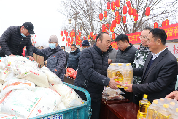 1月25日,永年区广府古城东街村村民在村委会门口上排起了长龙队,甘露寺广场上亦是搭起了舞台,台下坐满了70岁以上老人,现场每一个人们脸上都洋溢着灿烂的笑容。东街村委会门口两旁,整齐地码着米、面、油、肉、糖等十几种年货,今年是东街村党支部书记宋福如为村民置办年货的第十三个年头。据悉,今年为村民置办的年货种类达12样之多:2斤带鱼、1只白条鸡、2斤猪肉、1桶色拉油、1瓶香油、20斤大米、20斤精粉、10斤饺子粉、1袋糖块、1袋瓜子、1袋花生、1袋粉条,让全村人过春节不用再花一分钱。在保证村民日常需求之外,让村民新年品尝新味道,让东街村新年充满新气象!